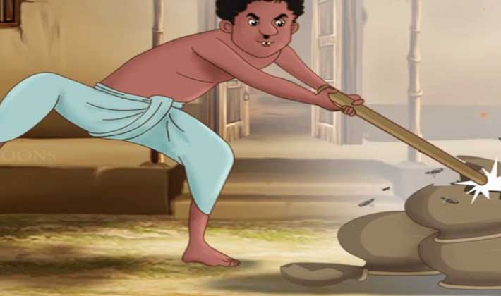 একদিন কানাইয়ের স্ত্রী কতকগুলি হাঁড়ি রোদে দিয়ে বলিল, ‘দেখ যেন কিছুতে মাড়ায় না।’ কানাই কিছু চিঁড়ে আর ঝোলাগুড় এবং এবং একটা লাঠি লইয়া হাঁড়ি পাহারা দিতে বসিল। এক-একবার চিঁড়ে খায় আর এক-একবার হাঁড়ির পানে তাকাইয়া দেখে, কিছুতে মাড়াইল কি না। কানাইয়ের ঝোলাগুড়ের খানিকটা কেমন করিয়া হাঁড়ির উপর পড়িয়াছিল, অনেকগুলি মাছি রোসো!’ এই বলিয়া সে তাহার লাঠি দিয়া মাছিগুলিকে এমন এক ঘা লাগাইল যে তাহাতে মাছিও মরিয়া গেল, হাঁড়িও গুঁড়া হইয়া গেল।